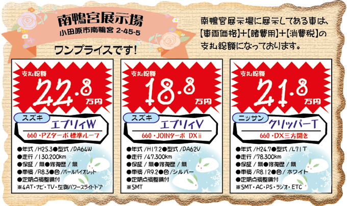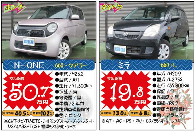格安車お探しの方はご連絡下さい。当店で代車として使用している車を提供いたします。 他のお客様に代車として貸し出ししている場合がございますので、事前にご連絡をお願いいたします。格安車は基本的に現状販売となります。